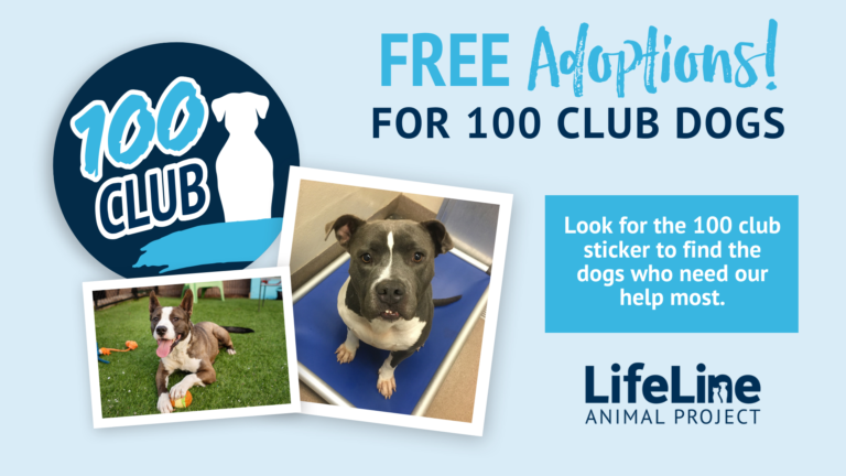 We offer FREE adoptions for all long-stay dogs (100+ days). When you visit a LifeLine shelter, look for the promotional sticker on our kennel cards indicating an adoptable dog with a sponsored fee!